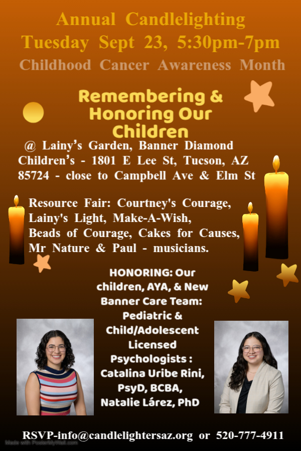 Candlelighters is a Tucson based non-profit organization serving families in Southern Arizona who have a child/teen diagnosed with cancer or other blood disorder. This includes leukemia, brain tumors, solid tumors, sickle cell anemia, other anemia’s and other blood disorders. Programs include summer camp, holiday parties, information resources and other support services. Families can self-refer or be referred by their social worker.
